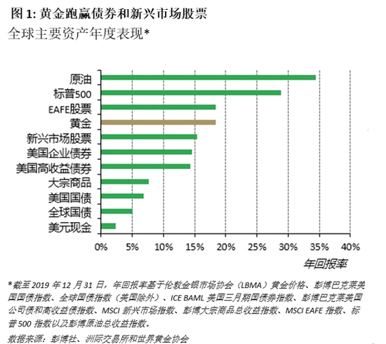 2019年的黄金表现是自2010年以来最好的。去年,以美元计价的黄金价格上涨了18.4%,跑赢了同期全球主要债券和新兴市场股票指数。