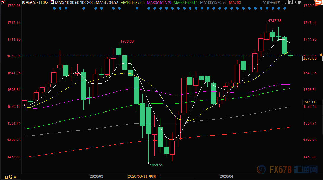 上周五因投资者揣测美国经济不久将逐渐摆脱防疫封锁以及寻找疫情治疗方法的进程中出现了转机,美股上涨,使得黄金一度跌至1670美元附近。