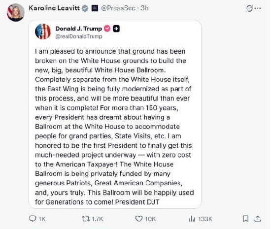 白宫新闻秘书卡洛琳·莱维特周一在社交媒体上分享了特朗普的一篇帖子,宣布“新的、又大又漂亮的白宫宴会厅已经破土动工”。