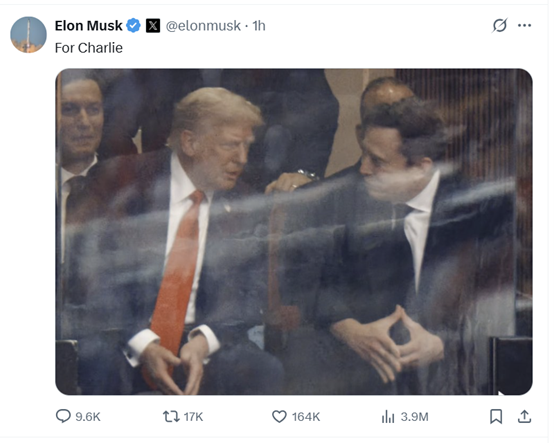 随后,马斯克在社交媒体平台X上发布了自己与特朗普同框交谈的图片,并表示:“为了查理”(For Charlie)。