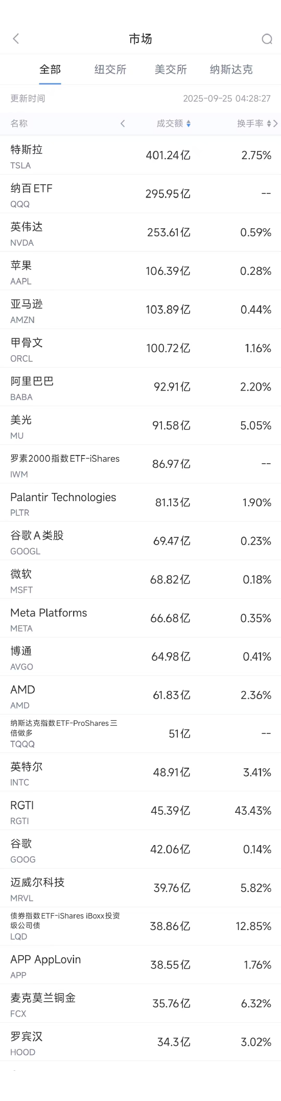 9月25日美股成交额前20:阿里巴巴正式宣布与英伟达开展AI合作