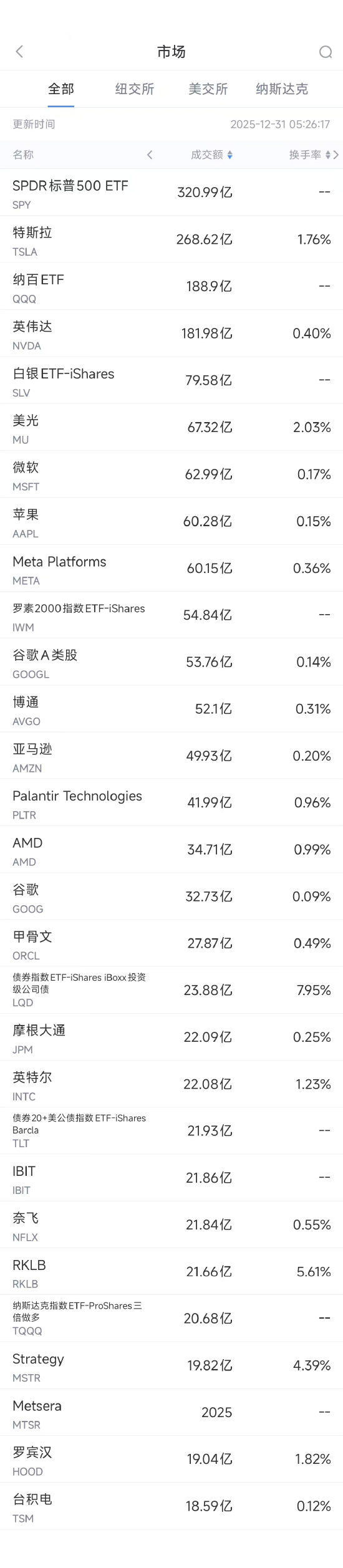 12月31日美股成交额前20:台积电2纳米芯片开始量产